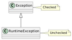 - Excepciones Checked: Objetos de la clase Exception o cualquier otra clase que hereda de ella, excepto si heredan de RuntimeException.