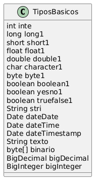 public class TiposBasicos implements Serializable { private int inte; private long long1; private short short1; private float float1; private double double1; private char character1; private byte byte1; private boolean boolean1; private boolean yesno1; private boolean truefalse1; private String stri; private Date dateDate; private Date dateTime; private Date dateTimestamp; private String texto; private byte[] binario; private BigDecimal bigDecimal; private BigInteger bigInteger; public TiposBasicos() { } }