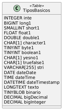 @Entity @Table(name="TiposBasicos") public class TiposBasicos implements Serializable { @Id @Type(type="integer") private int inte; @Type(type="long") private long long1; @Type(type="short") private short short1; @Type(type="float") private float float1; @Type(type="double") private double double1; @Type(type="character") private char character1; @Type(type="byte") private byte byte1; @Type(type="boolean") private boolean boolean1; @Type(type="yes_no") private boolean yesno1; @Type(type="true_false") private boolean truefalse1; @Type(type="string") private String stri; @Temporal(TemporalType.DATE) private Date dateDate; @Temporal(TemporalType.TIME) private Date dateTime; @Temporal(TemporalType.TIMESTAMP) private Date dateTimestamp; @Lob private String texto; @Type(type="binary") private byte[] binario; @Type(type="big_decimal") private BigDecimal bigDecimal; @Type(type="big_integer") private BigInteger bigInteger; public TiposBasicos() { } }